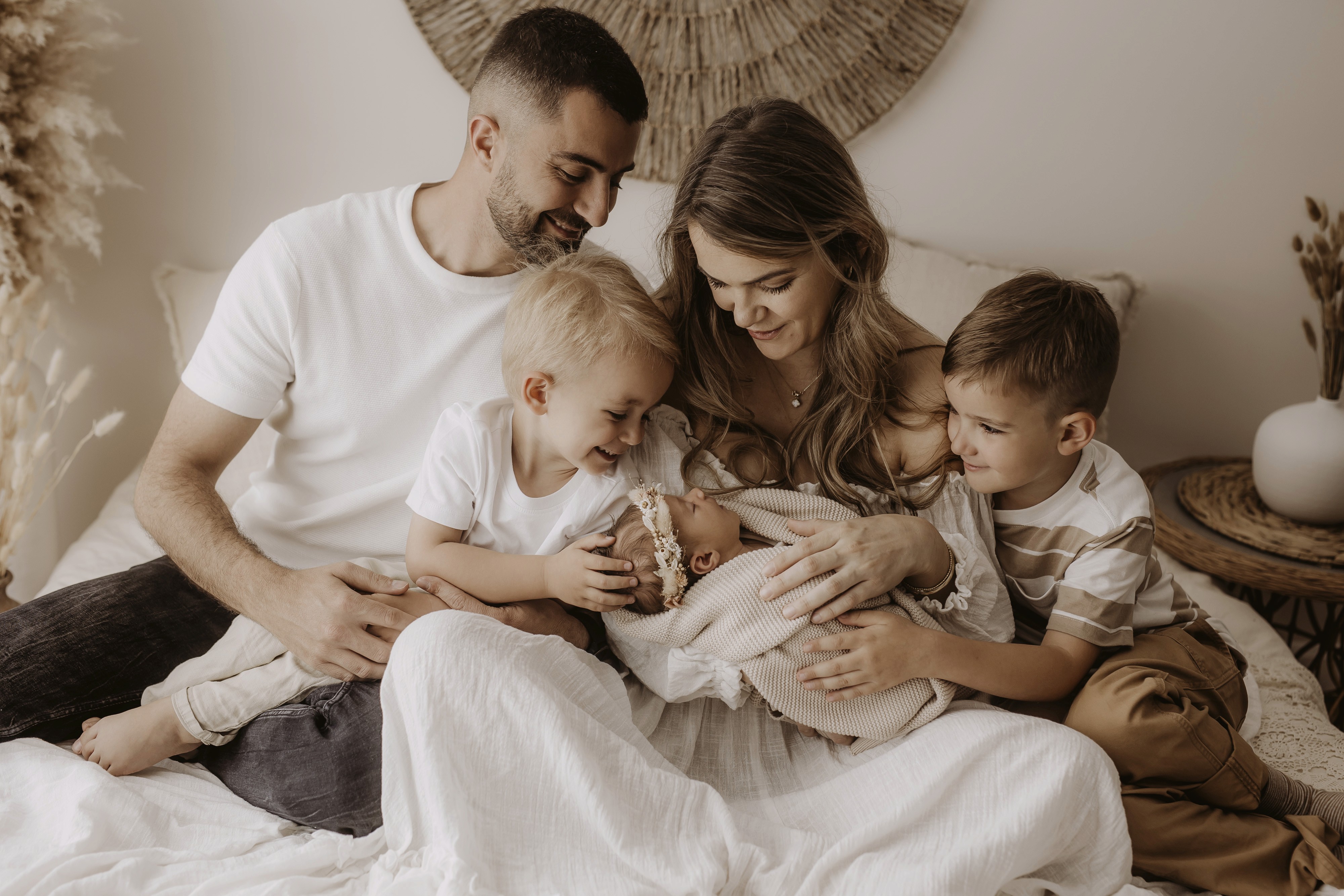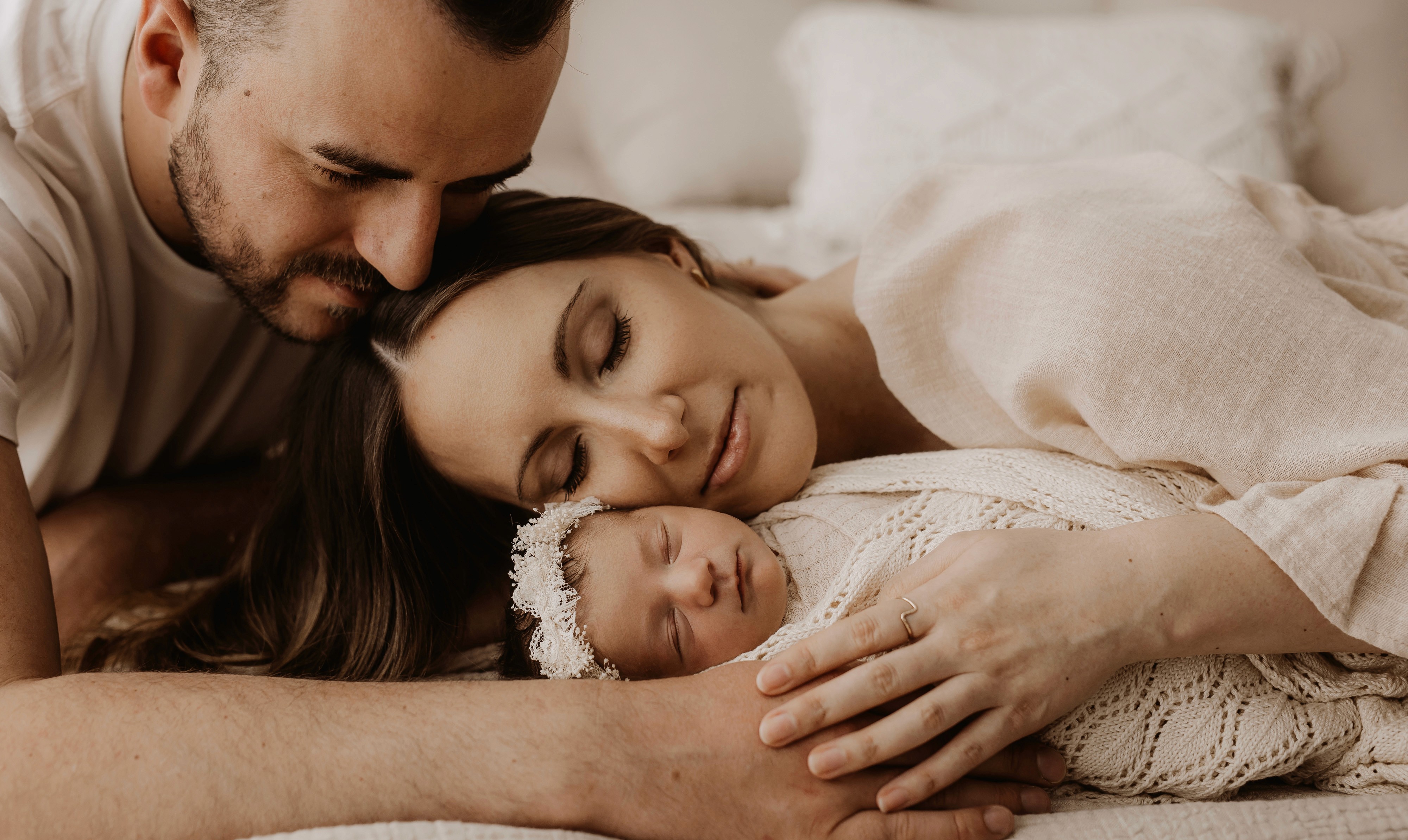 Lifestyle newborn photos are prop free and family centered. The focus is on natural poses on my styled bed and connection with family. My studio space is decorated in earthy muted neutral tones with boho florals. To match this vibe I provide neutral baby outfits, blankets and headbands. Not to mention the most incredible selection of dresses for mama to wear.
