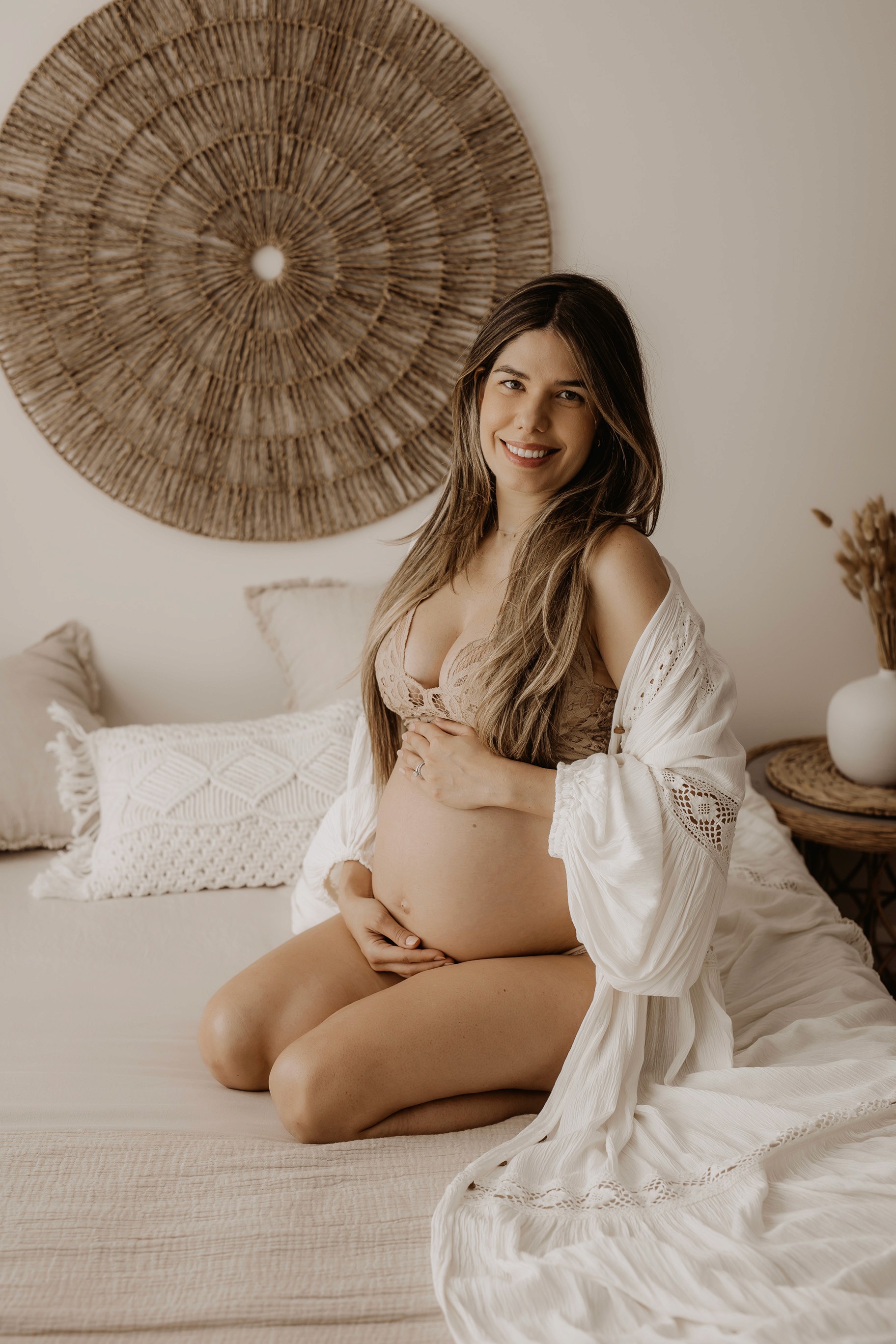 My maternity sessions are a mix of lifestyle photos on my styled bed, back-lit images, and standing photos in front of a draped wall. I will guide you through all the poses and tell you exactly what to do (where to put your hands, where to look, etc.). Remember to relax and enjoy the experience. This is a celebration of you, your baby bump, and the joy of impending motherhood.